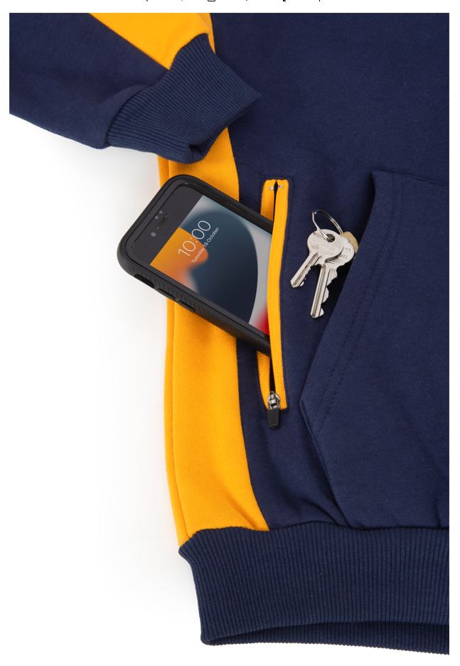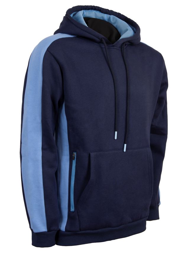 A contemporary design with striking contrast panels to shoulders and body, features a large kangaroo pocket located to the front and a zip side pocket which follows undernether the kangaroo pocket giving extra storage and security for your belongings.